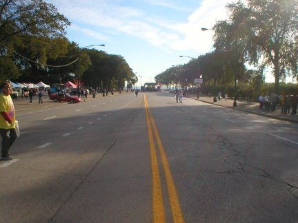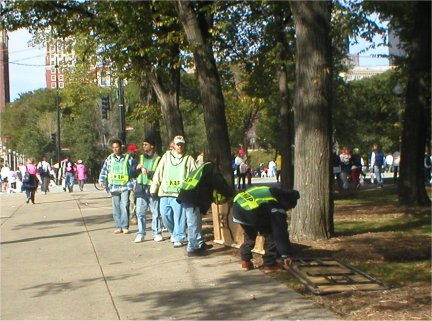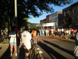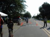 The Runners line up...Eileen takes a shortcut between barriers...After the race...Kathy takes a well-deserved cigarette break.