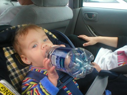 Laura's ribbon looks like a tail....Daphne plays with Mommy's water bottle.