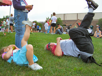 Before the race: The girls get balloons....and practice running....Erin and Grandma Kathy
