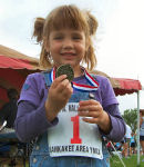 Daphne shows us her medal....Erin shows us the apple she is eating