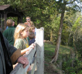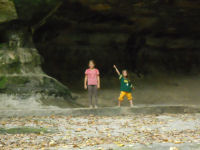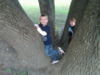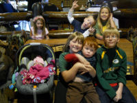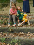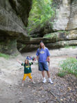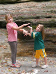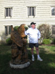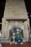 Straved Rock Lodge for Brunch:  Pat posing with a statue....The Kids playing with Darren
