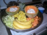 Fruit face for the party, meeting Grandpa Terry, Laura and Roger, kisses from cousins Hannah and Alex