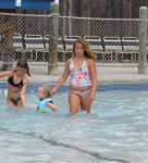 All three in the big pool....Daphne coming down the orange slide....Erin in the water sprays....Tessa gives her life jacket to her monkey