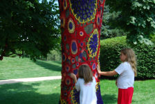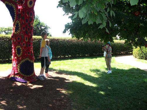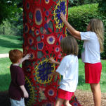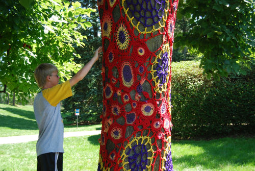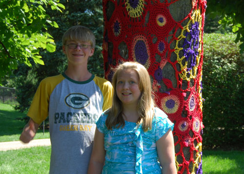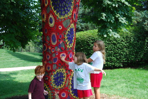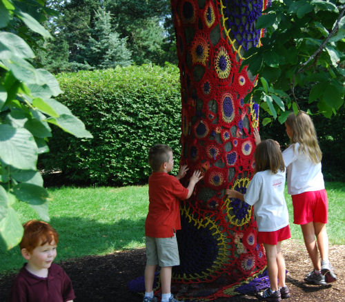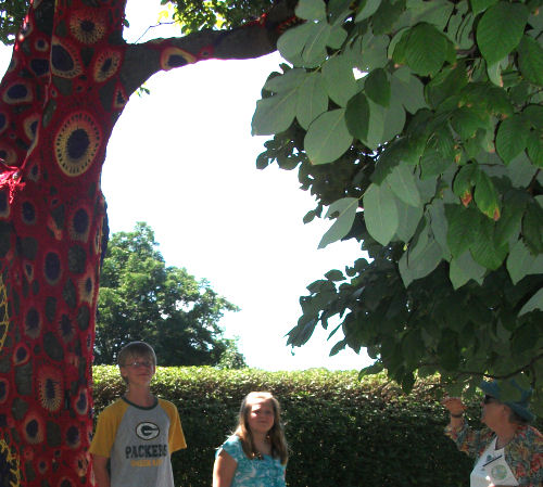 Daphne, Erin, Brendan and Owen examine the crocheted tree