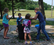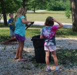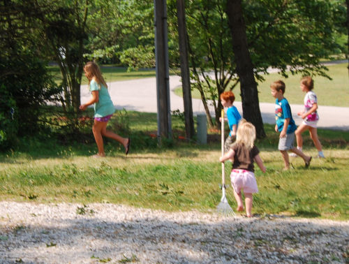 Laura and the girls showed up for clean-up....Tessa and Jean manned the rakes....Loading the leaves....Jeff still splitting